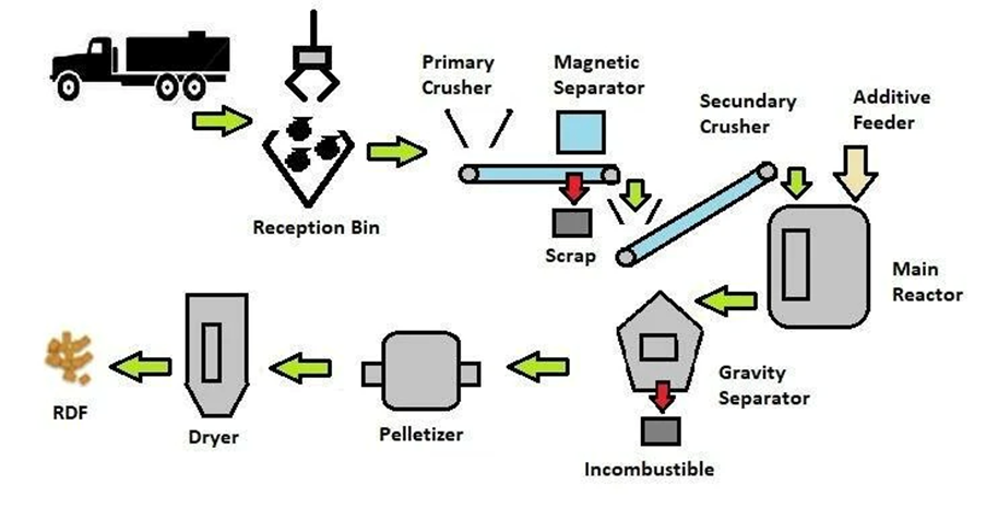 Refuse-Derived Fuel (RDF) adalah proses mengolah sampah menjadi pelet atau serbuk bahan bakar yang dapat digunakan di industri seperti pabrik semen atau boiler khusus.