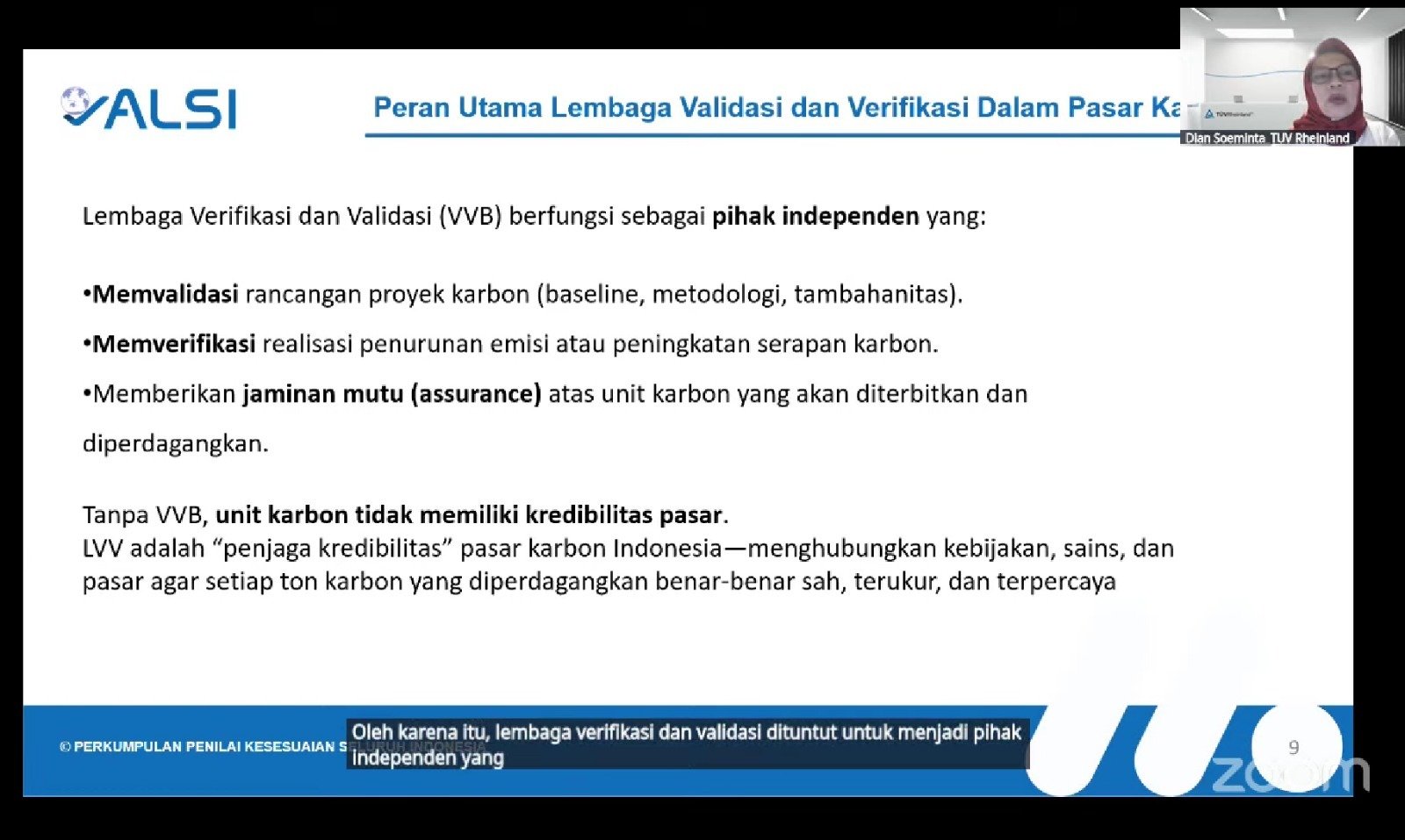 Kredibilitas menjadi fondasi utama dalam pengembangan dan perdagangan proyek karbon di Indonesia. Dian Susanty Soeminta dari Asosiasi Lembaga Sertifikasi Indonesia (ALSI) menegaskan bahwa persoalan tersebut harus dijawab melalui proses validasi dan verifikasi yang independen dan berintegritas. Menurutnya, unit karbon tidak akan memiliki nilai dan kepercayaan pasar tanpa peran lembaga validasi dan verifikasi (LVV).