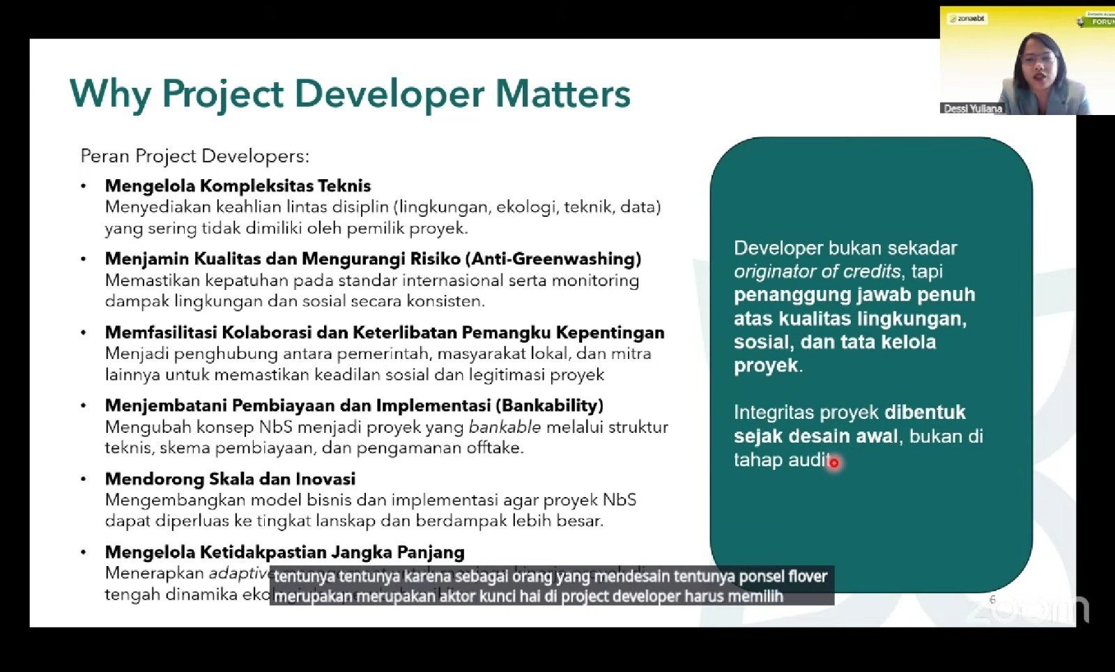 Dari perspektif pengembang proyek, Dessi Yuliana, CEO CarbonX, menekankan bahwa project developer merupakan aktor kunci dalam memastikan integritas proyek karbon sejak tahap perancangan. Menurutnya, pengembang proyek tidak hanya bertanggung jawab pada aspek teknis pengukuran emisi, tetapi juga pada desain sosial, ekonomi, dan lingkungan.