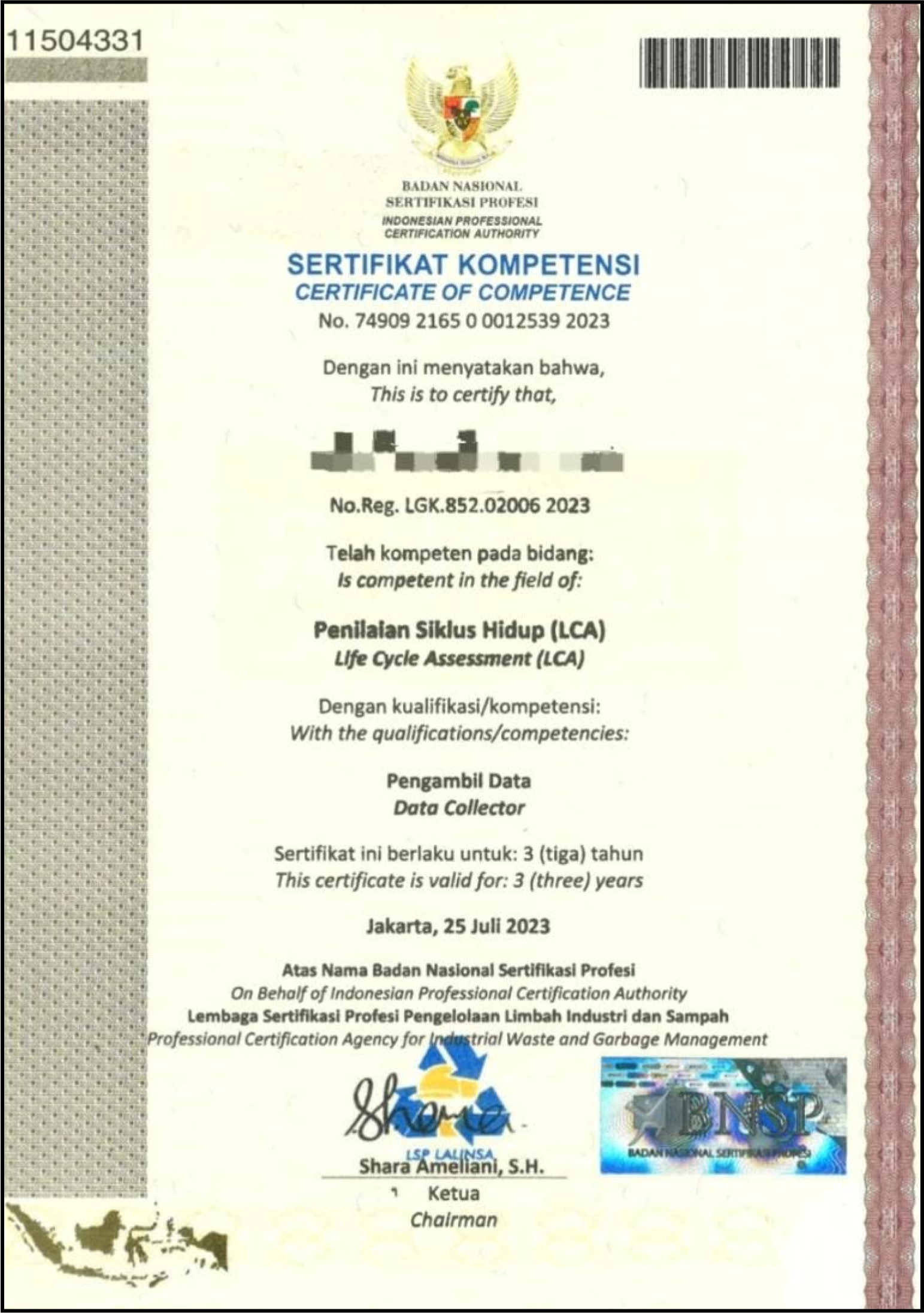 Dapatkan Sertifikat Sertifikasi LSP LALINSA resmi yang dapat meningkatkan kredibilitas profesional Anda di bidang DAUR HIDUP (LCA) !