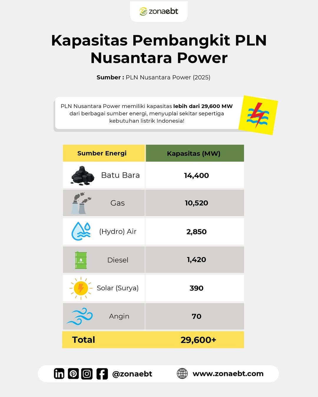 - PLN Nusantara Power mengelola 29,600 MW kapasitas energi dengan dominasi batu bara 14,400 MW dan gas alam 10,520 MW.