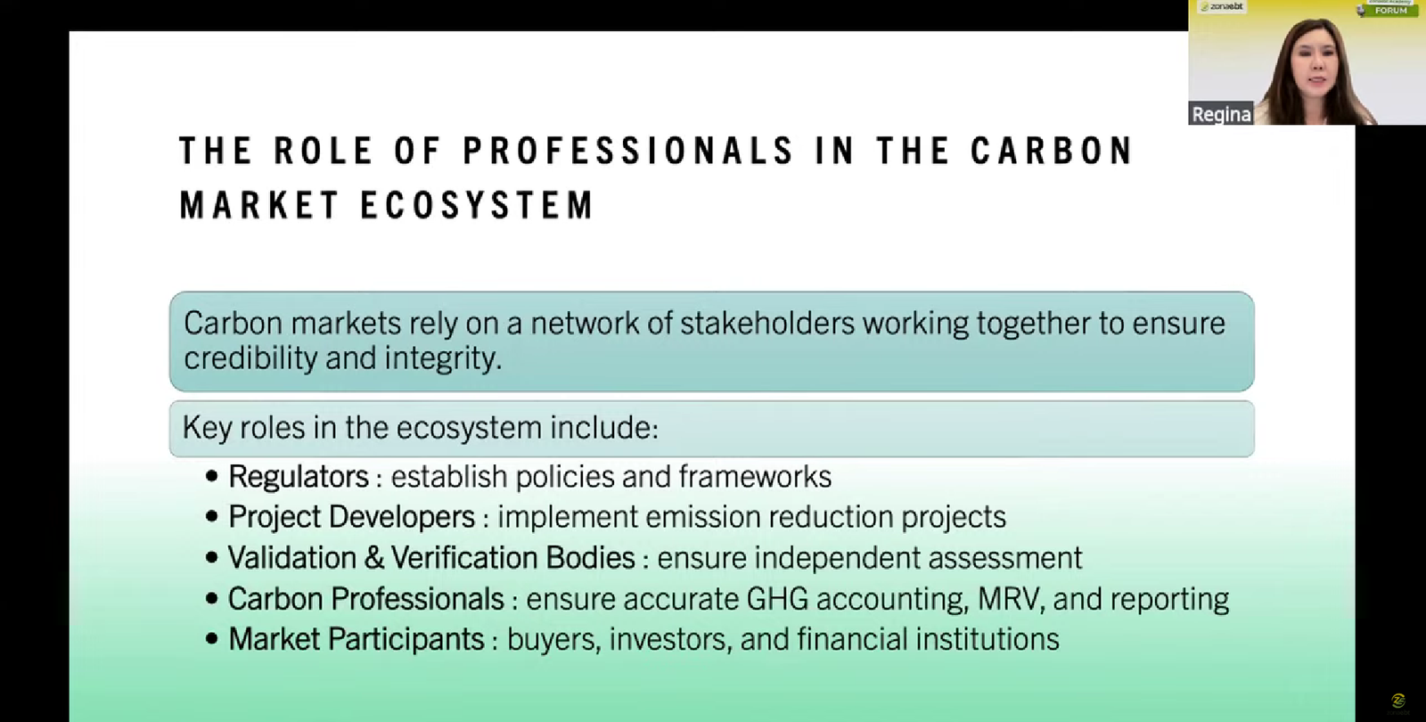 “Saya ingin memberikan perspektif dari para praktisi karbon dalam ekosistem pasar karbon Indonesia 2026. Jika ditarik benang merahnya, para praktisi GHG memiliki berbagai peran dalam pasar karbon, mulai dari regulator, project developer, validation and verification bodies, carbon professionals, hingga market participants,” jelas Regina.