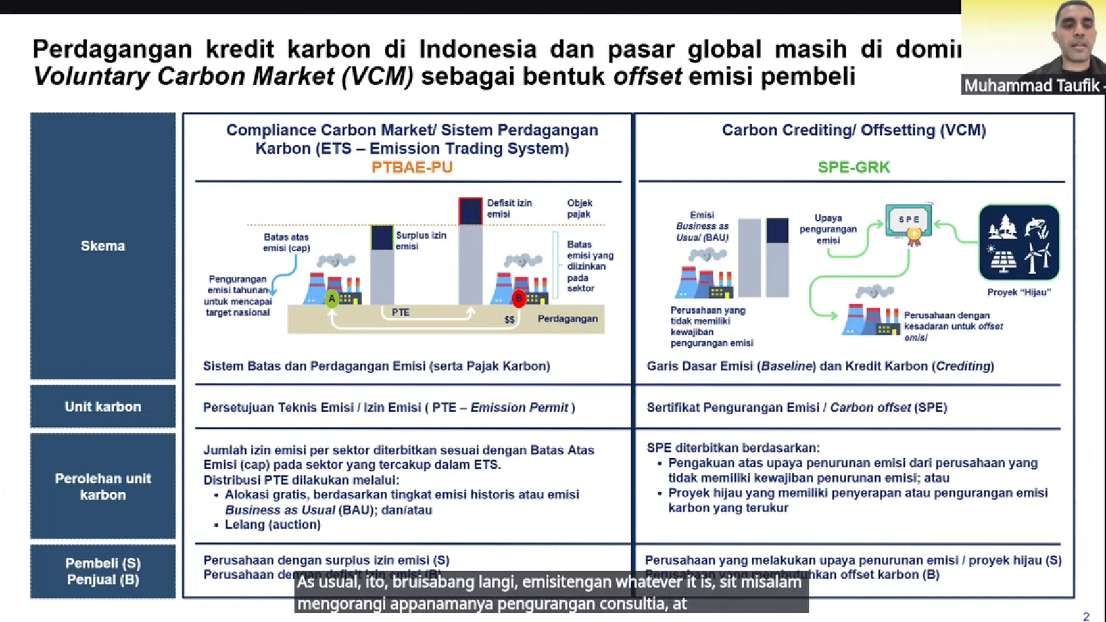 Sementara itu, M. Taufik, Strategic Partnership and Marketing Manager Pertamina NRE, membahas perspektif pengembang proyek karbon dan energi transisi. Ia menjelaskan bagaimana sektor energi melihat potensi pasar karbon sebagai bagian dari strategi transisi energi sekaligus upaya dekarbonisasi industri.