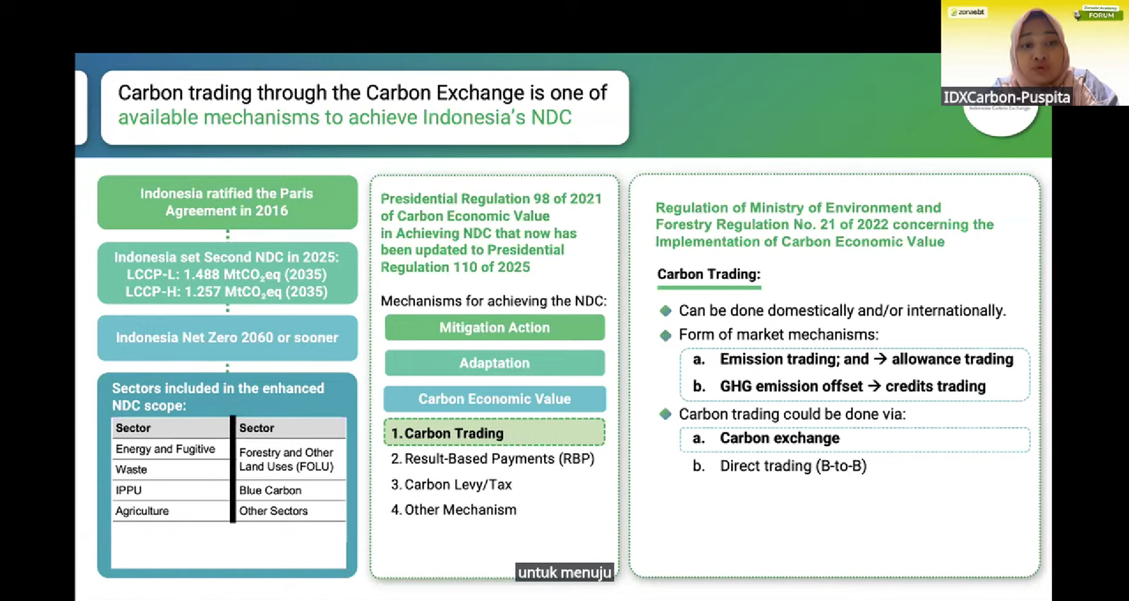 Forum ini diselenggarakan secara daring melalui Zoom dan disiarkan langsung melalui kanal YouTube ZONAEBT, serta terbuka bagi pelaku industri, akademisi, investor, maupun masyarakat yang ingin memahami perkembangan pasar karbon dan peluangnya di Indonesia. Bagi yang terlewat, dapat menonton tayangan ulang melalui tautan berikut: